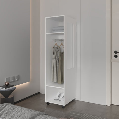 "Enhance your room with our wardrobe on wheels, made of particle board and melamine. This wardrobe features a door and an integrated mirror, offering ample space for clothing and accessories. The sturdy wheels make it easy to move, allowing for effortless repositioning and cleaning. Its sleek and simple design fits any decor style, adding a touch of sophistication to your space. Optimize your organization and add a modern element to your room with this practical wardrobe with wheels and mirror.