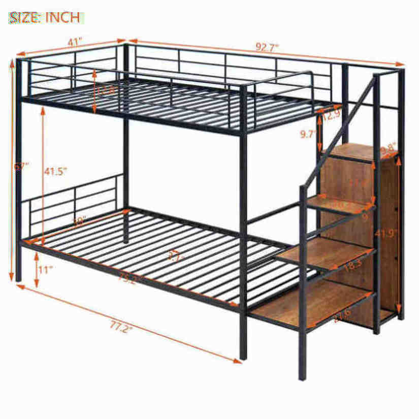 This stylish metal bunk bed with desk is made with sturdy metal and has a clean-cut silhouette that can be matched with any room decor. The lateral 3-layers ladder of the bunk bed can be used as shelves to lay out home items for you.And the wardrobe underneath the ladder is an elegant design which offer you space to store everyday clothes.It will definitely save plenty of space for you.An ideal space-saver and a perfect addition for a growing family, the bunk bed efficiently accommodates little ones, and young teens, allowing them the freedom and space to host friends.This bunk bed will be a beautiful and practical piece in your bedroom.