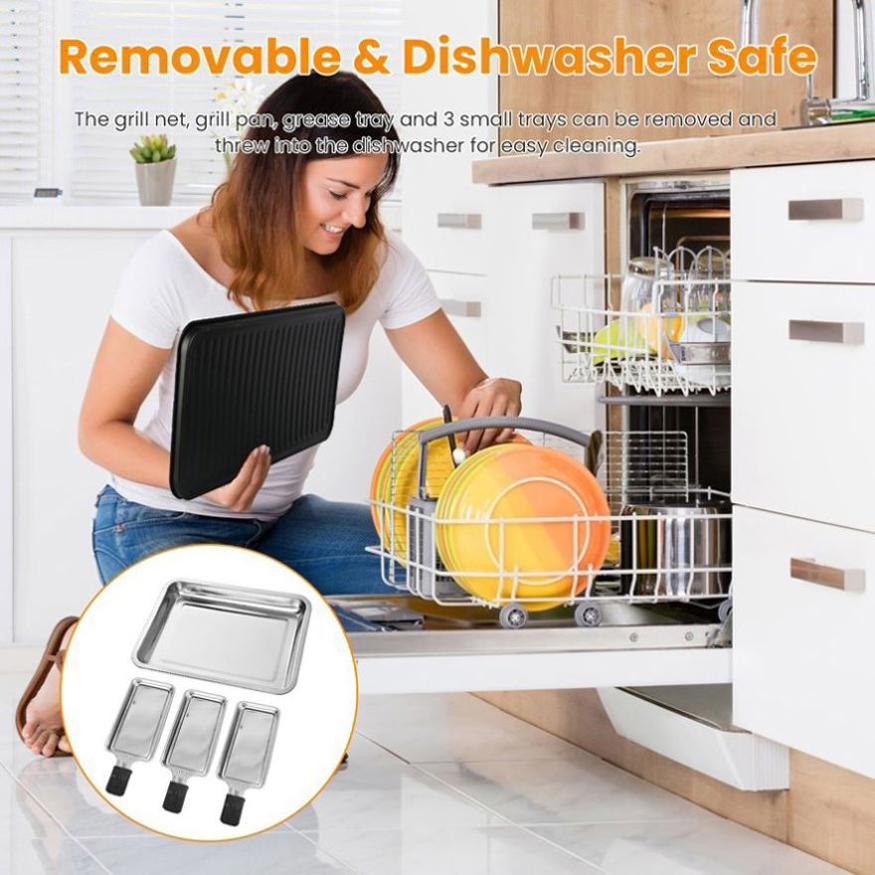 - Removable & Dishwasher Safe: The grill net, grill pan, grease tray and 3 small trays can be removed and threw into the dishwasher for easy and quick cleaning.