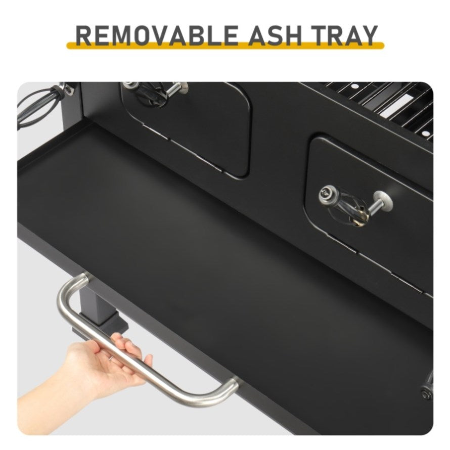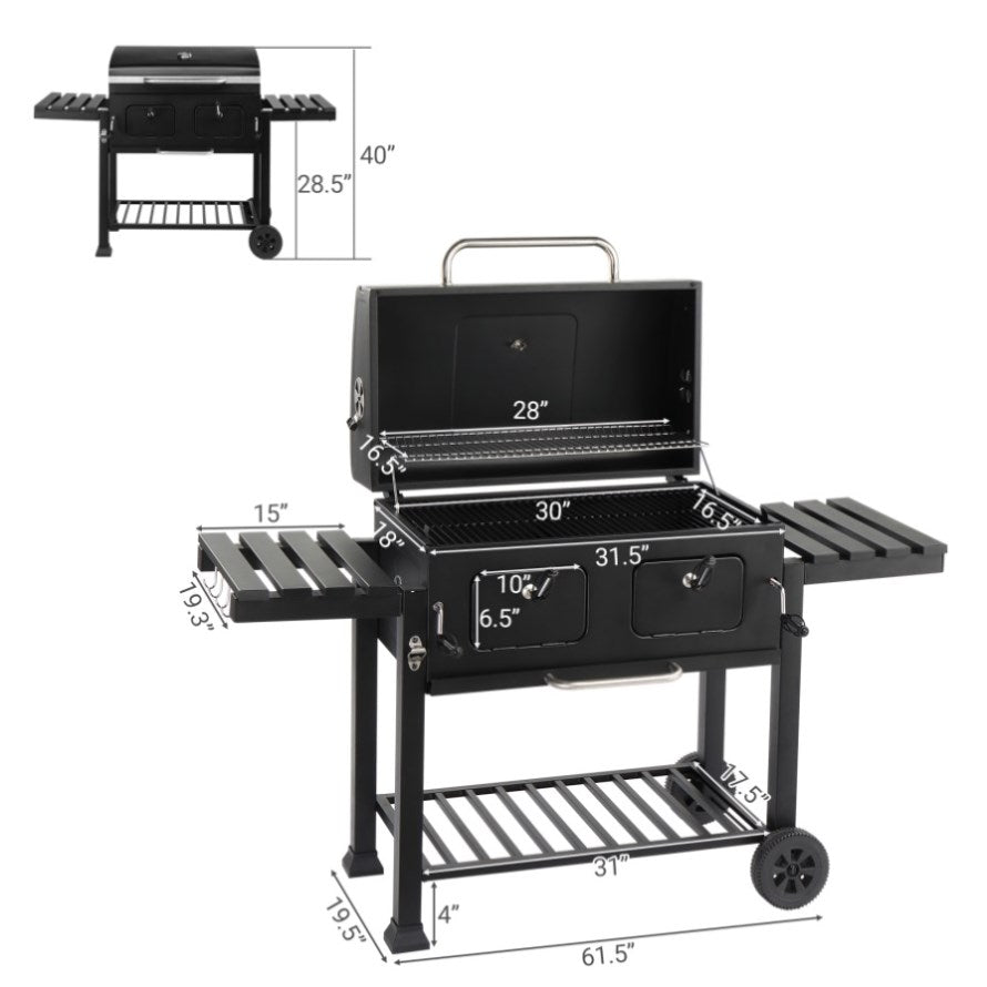 Take your outdoor cooking experience to the next level with this extra-large charcoal grill. Designed for backyard barbecues, camping, and picnics, this grill offers a spacious cooking area that fits up to 30 burgers at once, making it perfect for family gatherings and parties. Featuring two independently adjustable charcoal trays, you can easily control the heat for different cooking zones. The foldable side tables and bottom shelf provide ample storage, while the two front charcoal access doors allow you to add fuel without disturbing your food. Built with high-quality steel and a high-temperature powder-coated surface, this durable grill is designed for long-lasting performance.
