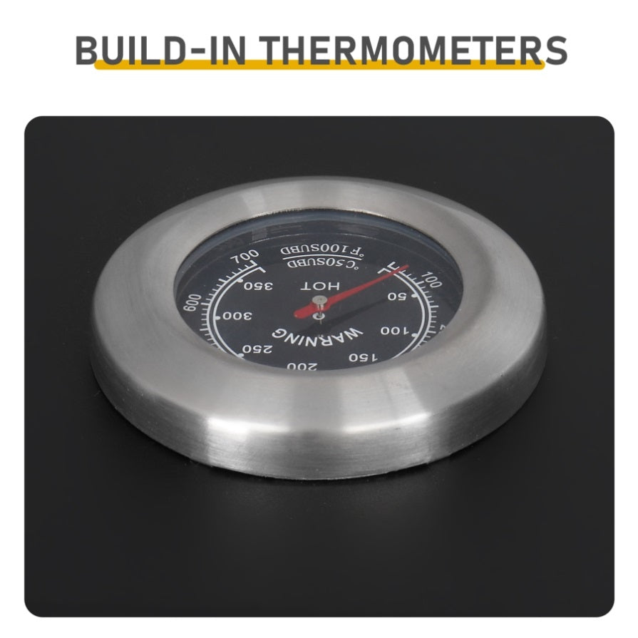 3. Convenient Front Charcoal Access: Two individual charcoal access doors let you add fuel without moving food or removing grates. Designed with cooling handles for added safety.