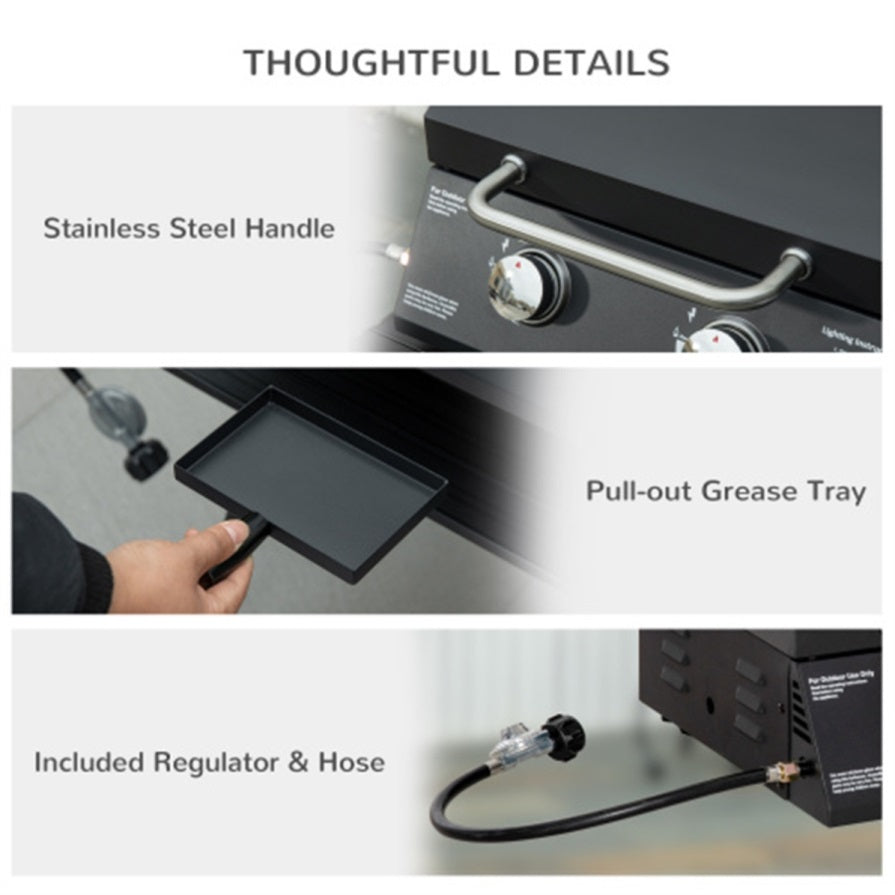 - All burners controlled by piezo ignition - Included grill lid enables it to preserve delicious smoked flavors - An easy-to-read thermometer keeps track of the internal temperature - Cool-touch stainless steel handles for safety when cooking - Foldable legs for compact storage and convenient transport - Removable ashtray for easy cleaning - Assembly required