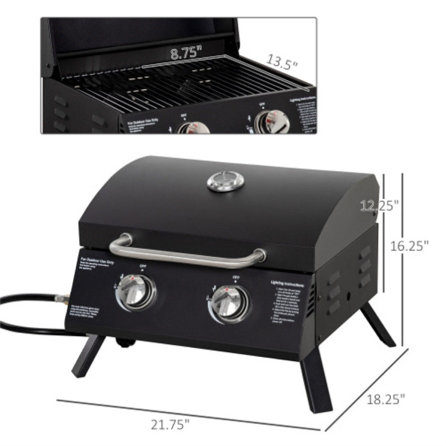 - Color: Black - Material: Carbon Steel, Stainless Steel - Gas type: Ethane/Propane - Overall Dimensions: 21.75" L x 18.25" W x 16.25" H - Folded Dimensions: 21.75" L x 18.25" W x 12.25" H - Grill Net Dimensions: 8.75" L x 13.5" W - Ash Tray Dimensions: 6.5" L x 4.75" W x 1" H - Foot Dimensions: 5" L x 0.5" W x 1.25" H - Weight Capacity: 11 lbs. - 1 x Gas Grill - 2 x Grill Net - 1 x Regulator - 1 x Hose - 1 x Manual