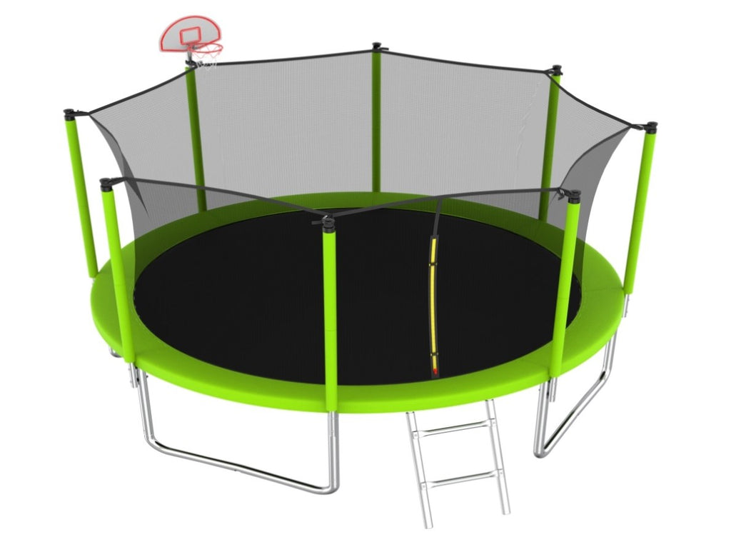 8 foam padded poles to support UV-proof safety trampoline enclosure net for maximum safety while jumping. Heavy duty 3-step galvanized steel ladder offers convenient maneuverability in and out of the trampoline.