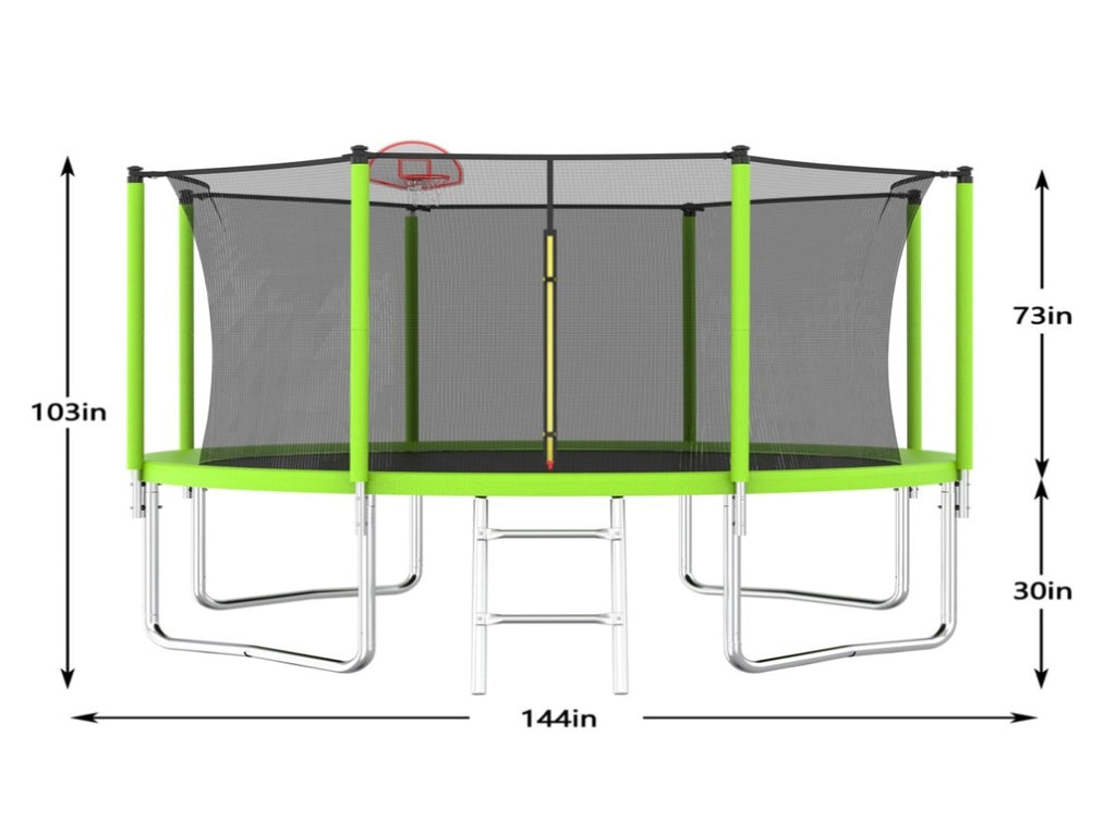 12 FT Trampoline is equipt with 8 high safety enclosure poles and heavy gauge galvanized rust resistance steel construction. 4 W-shaped legs secure stability. For the safety of every user, we have ensured that our recreational trampoline meets ASTM and CPC standard safety specifications
