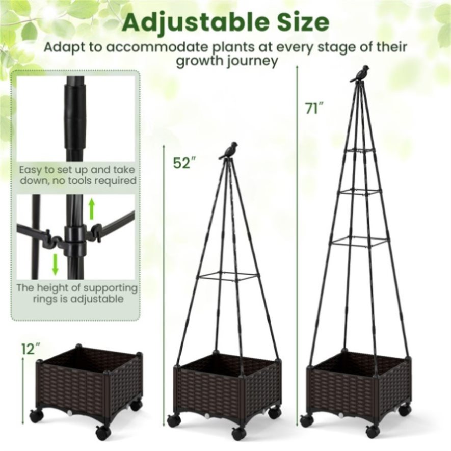 ● Adjustable Size and Easy Setup: The planter box with trellis comes with 2 adjustable heights (71"/52"), while the height of supporting rings is also adjustable by moving up and down, which could adapt to accommodate plants at every stage of their growth journey.   With its simple structure, the planter is easy to set up and take down, no tools required.