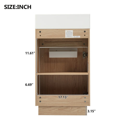 Upgrade your bathroom with this 18.5" Rustic style vanity featuring a veneer of Wood Grain Triamine and easy-to-clean resin sink. Thoughtfully designed with an adjustable shelf, it offers smart storage for daily essentials without taking up extra space. The clean lines and quiet soft-close doors add a touch of elegance and calm to your routine. Perfect for small bathrooms seeking both beauty and function.