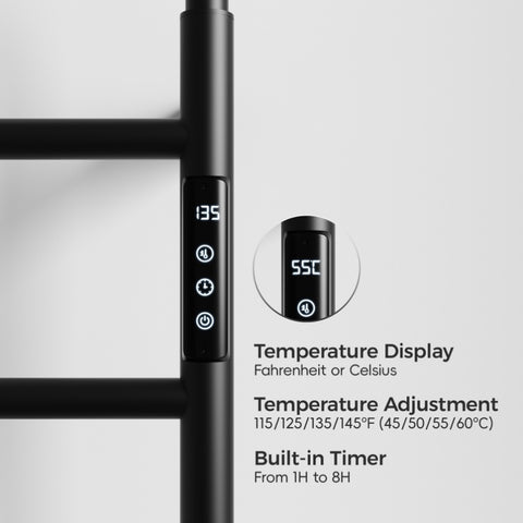 Smart Touchscreen Control : The user-friendly touchscreen allows effortless customization of the heating experience. After turning on the heated towel rack, it will heat up in 3-7 minutes and reach the optimal temperature of 122-131℉ within 30-40 minutesThe towel rack has a built-in overheating protection function, which will not overheat the heating rod and burn you or cause the towel to be scalded. You and your family will get comfortable towels after showering.