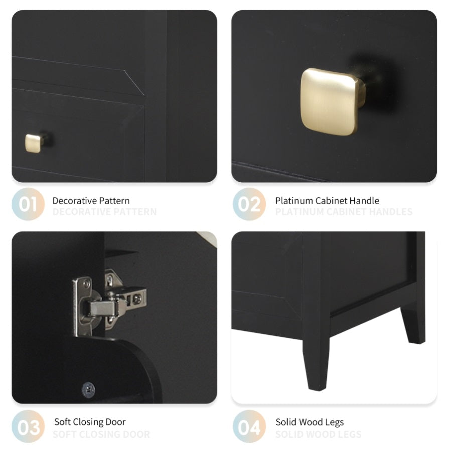 Thoughtful Details: Considering the humid environment in the bathroom, the door hinges and handle are made of stainless steel, which is not easy to rust. In order to keep silent when open and closing the door, the soft closing door is selected for this cabinet. Platinum knobs on the door, creating a modern look that is smooth to the touch and pleasant to use.