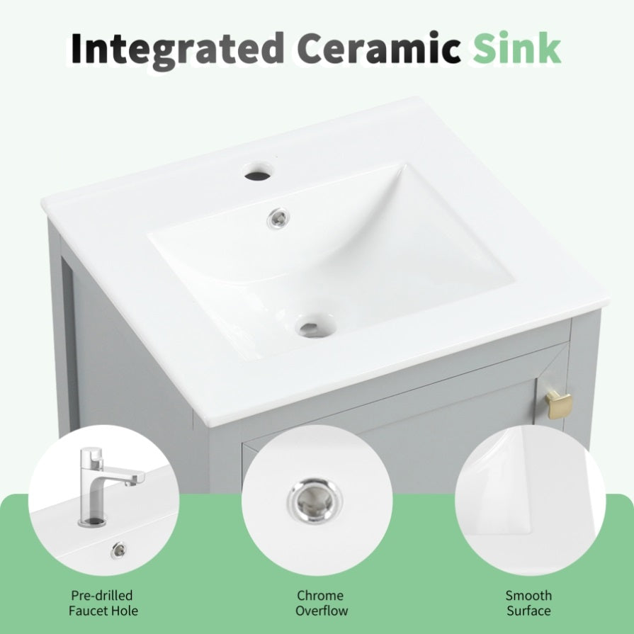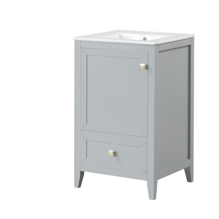 1. 20" Bathroom Vanity with Sink 2. High-quality MDF Board & Ceramic Sink & Painted Finish 3. Cabinet with Door & Storage Rack & One Drawer 4. One Package Details 1. Soft Closing Door 2. Metal Knobs 3. Stainless Steel Hinges