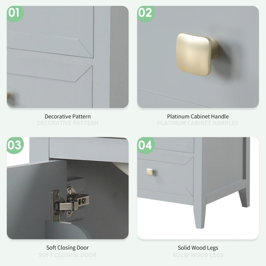 Material - Practicality and durability is important to bathroom facilities, so we use real wood and MDF boards for this product, which not only increases the product stability but also ensures a long-lasting use. Furthermore, the surface of this vanity cabinet is in painted finish. It is water-proof, stain proof and very easy to clean.