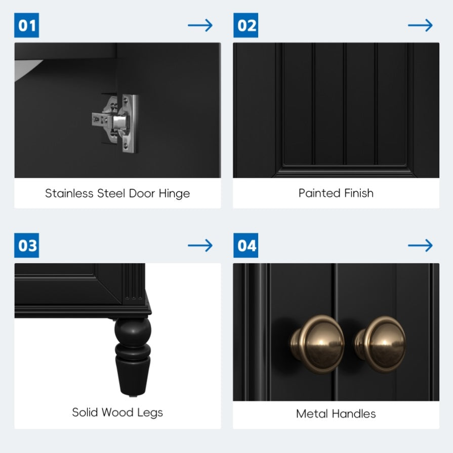Thoughtful Details: Considering the humid environment in the bathroom, the door hinges and handle are made of stainless steel, which is not easy to rust. In order to keep silent when open and closing the door, Magnetic door stoper is selected for this cabinet. Golden metal handles on the door, creating a modern look that is smooth to the touch and pleasant to use.