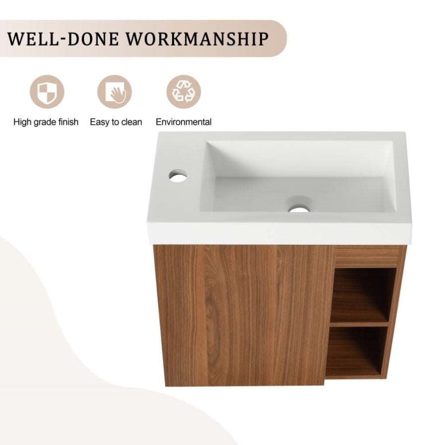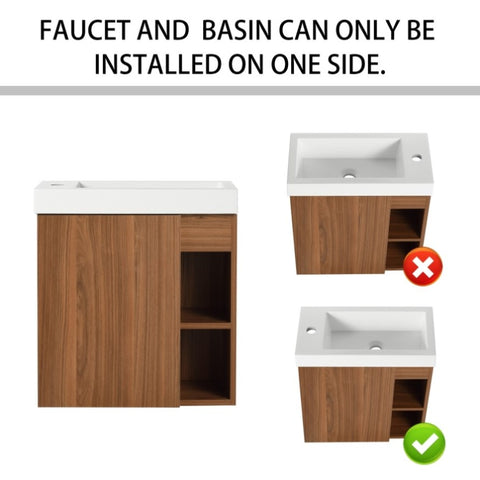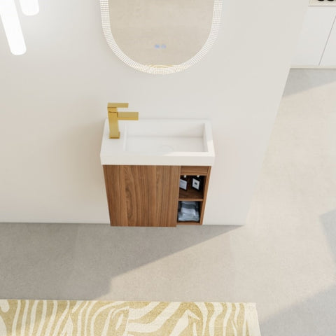A space-efficient bathroom solution, this small wall-mounted vanity features a single-door design with soft-close hinges. The cabinet is thoughtfully designed with two open storage shelves, providing convenient organization for daily essentials.