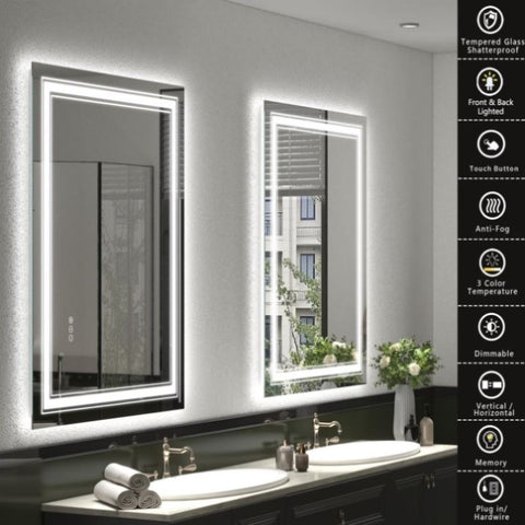 [Safe & Durable]: UL-certified components with protective casing. LED lifespan: 50,000+ hours (45+ years at 3 hours daily use). Copper-free silver mirror with far lower corrosion rates than standard mirrors. Features 5mm tempered glass for shatterproof, explosion-resistant, and long-lasting safety.
