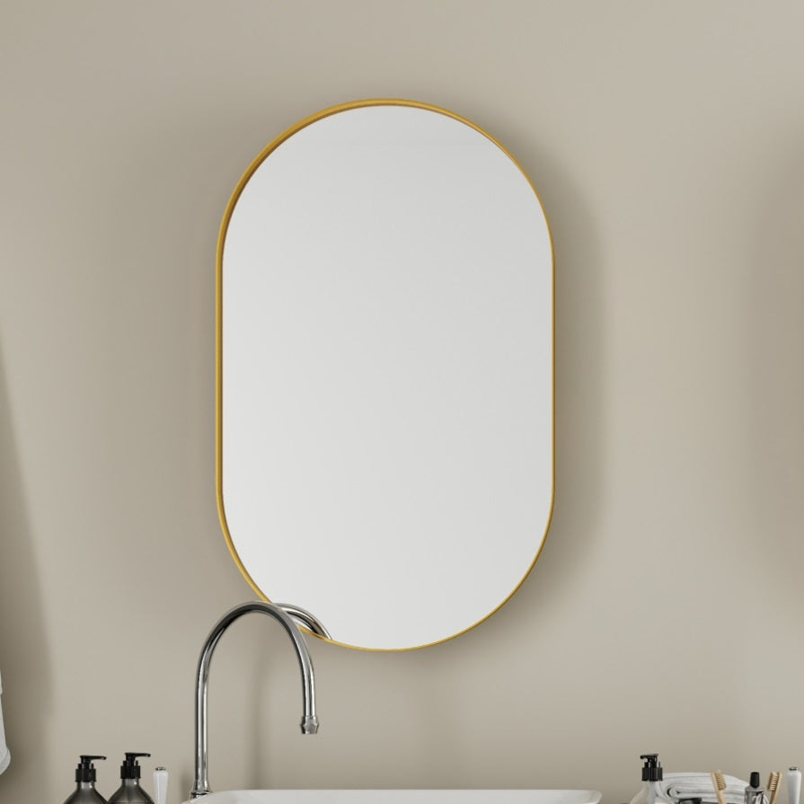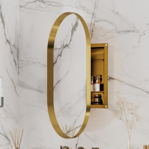 20x34 Inch Oval Recessed Gold Metal Framed Medicine Cabinet with Mirror and Adjustable Shelves