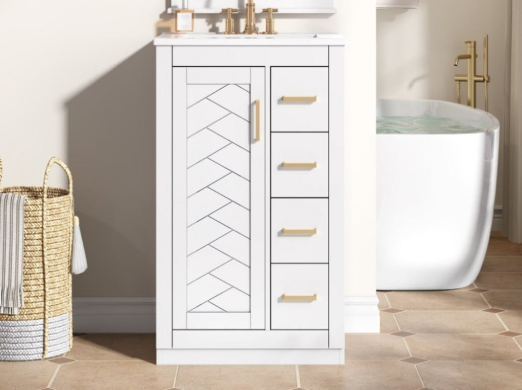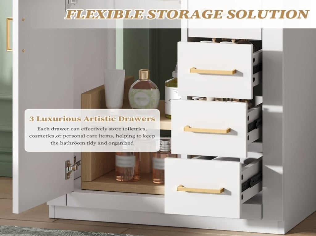 Contemporary Style.The bathroom vanity features a streamline minimalist look, and the polished golden hardware seamlessly coordinates with its clean lines, adding a touch of modern elegance, which pairs well with a variety of interior design styles. Bathroom Vanity with Soft-closing Door and Drawers: The simple cabinet style and modern handle design make this bathroom cabinet simple yet unique. The soft close mechanism ensures silent and smooth door operation, adding a touch of comfort.