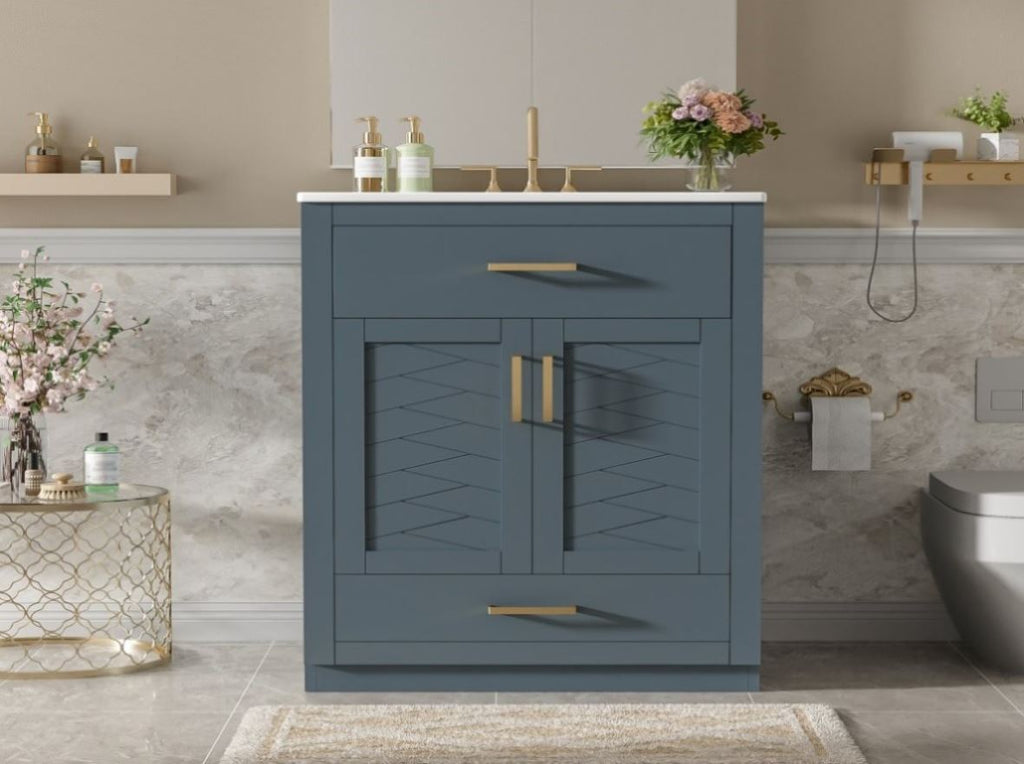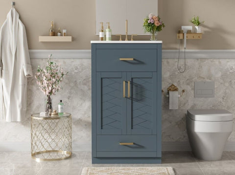 This elegant bathroom vanity combines smart functionality with timeless design. It features a spacious storage cabinet with a tip-out drawer,a full extension drawer and vintage-style hardware for flexible organization. The graceful sink basin offers both visual appeal and practicality, designed to fit standard 4-inch faucets (not included) with convenient pre-drilled plumbing access. Easy to assemble with clearly labeled components and included hardware, this compact vanity delivers both style and convenience, making it perfect for small spaces while complementing various bathroom décors.