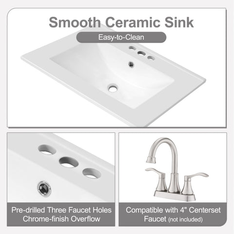 Ceramic Sink——The included ceramic sink is easy to clean and highly resistant to water stains. Pre - drilled with three faucet holes, it’s compatible with 4" widespread faucets (not included). An chrome-finish overflow prevents water spillage, ensuring safe and worry - free use.