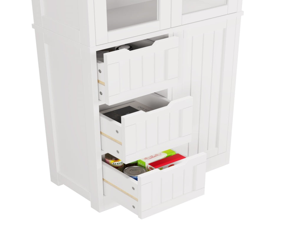 This white bathroom cabinet is aesthetically pleasing and highly practical. It features vertical stripes, which are fashionable and textured. With a layout of 3 doors, 3 drawers, and 4 layers, it offers abundant storage space. It can be used in bathrooms, laundry rooms, foyers, and dining rooms.