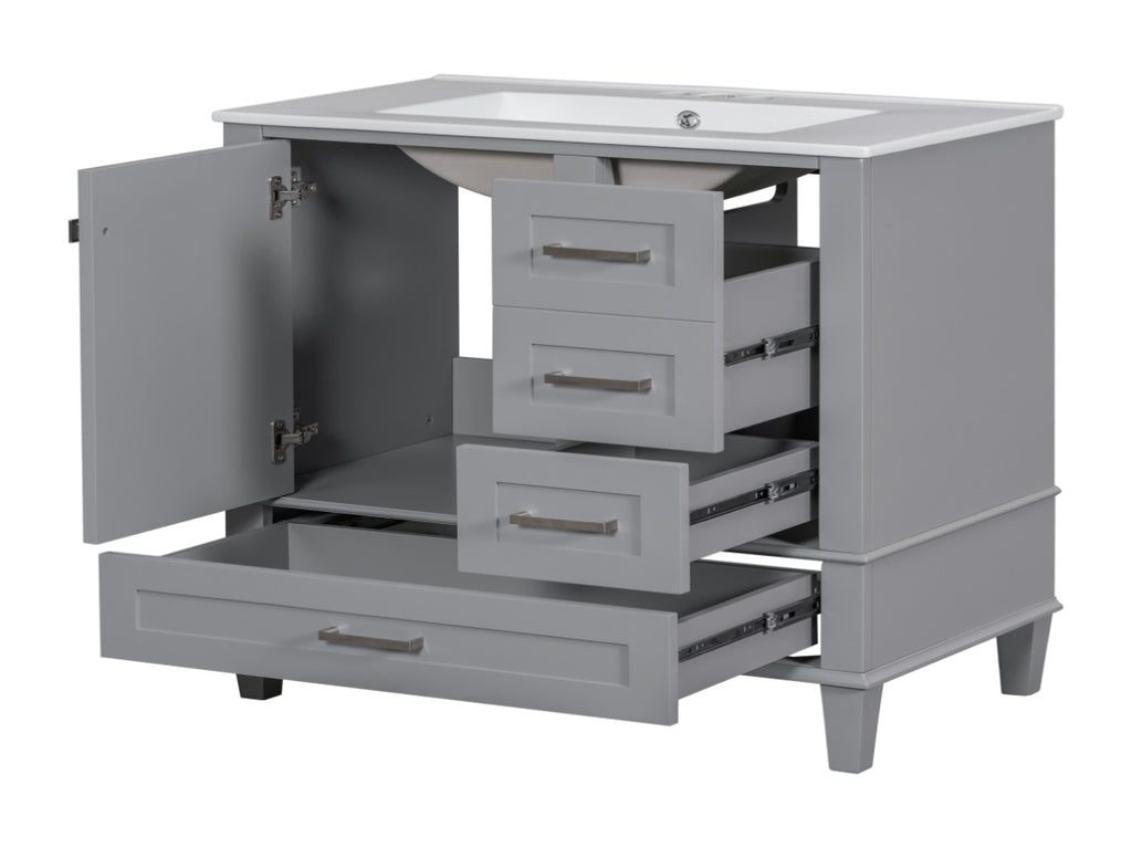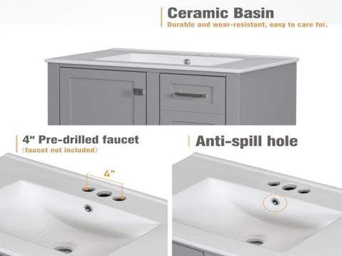 [Elegantly Modern Design]The grey cabinet with a white countertop creates a refreshing color combination that catches the eye. Its sleek lines and sliver handles add a modern touch, enhancing the aesthetics of your bathroom.