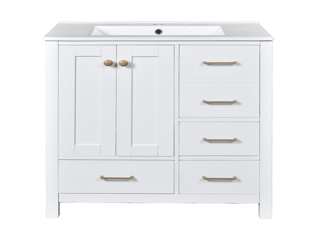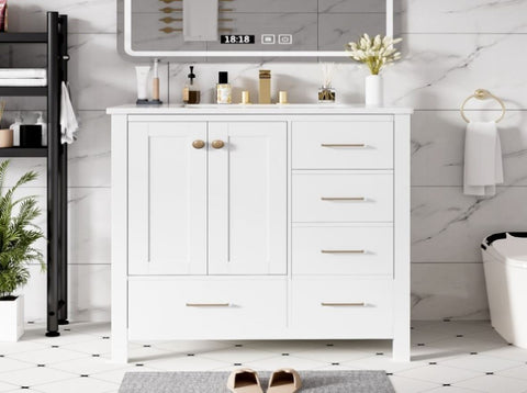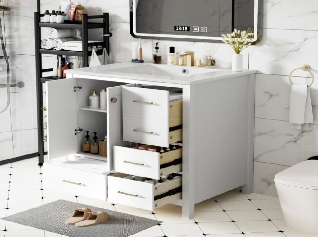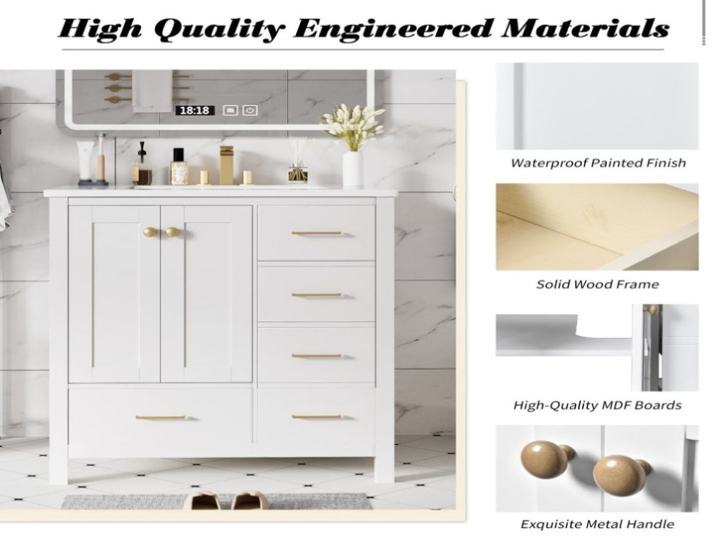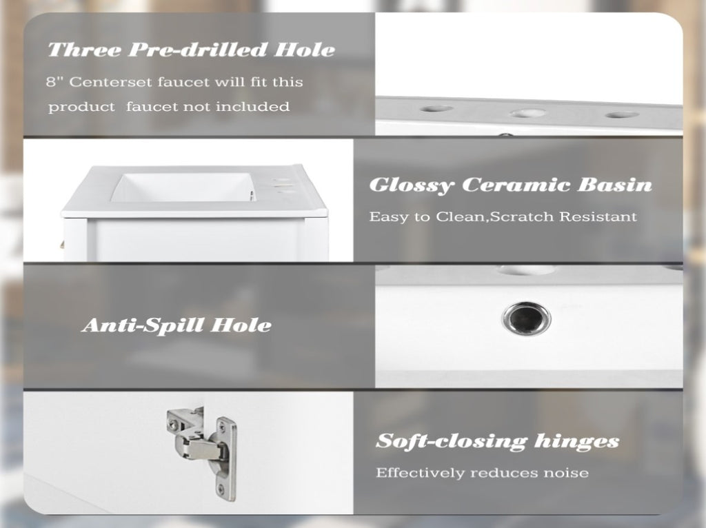 [ Multi-Purpose Cabinet & Concealed Storage ] Are you looking for stylish and functional storage solutions for your bathroom Our bathroom vanity provide ample space for all your toiletries and bathroom essentials. The combination of the cabinet body and the drawer perfectly stores all kinds of bathroom products and keeps the necessities away from water stains and dust. Soft-close doors and drawer fronts feature a water-resistant paint finish for durability.