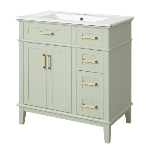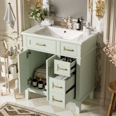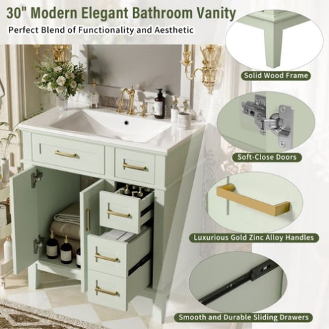 Upgrade your bathroom with this stylish and functional 30" vanity. Designed for small spaces, it maximizes storage with a deep drawer, a standard drawer, and a spacious under-sink cabinet—keeping your essentials organized and your bathroom clutter-free. The high-quality ceramic sink is easy to clean and features an overflow hole to prevent spills, ensuring a dry and tidy space. Built with a solid wood frame and premium MDF, this vanity is durable, sturdy, and long-lasting. The soft-close doors and elegant gold handles add a touch of luxury while enhancing everyday comfort. Elevate your bathroom with a perfect blend of beauty, storage, and practicality.