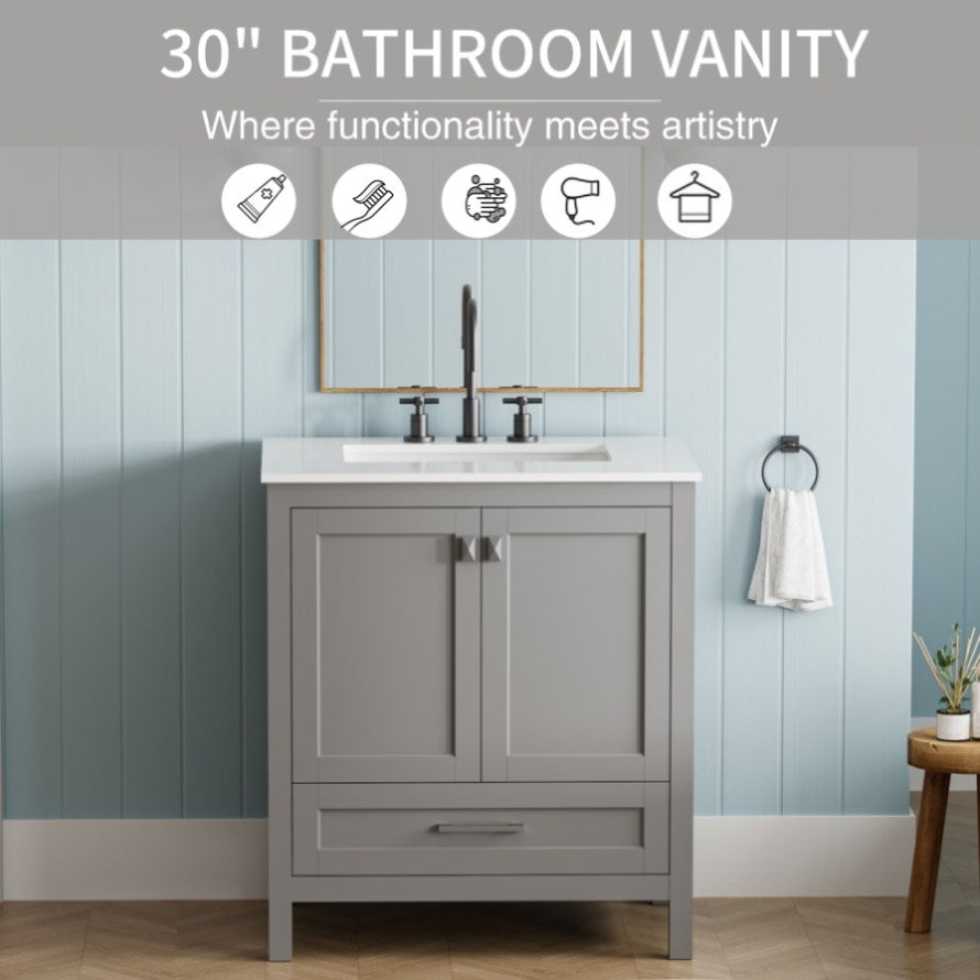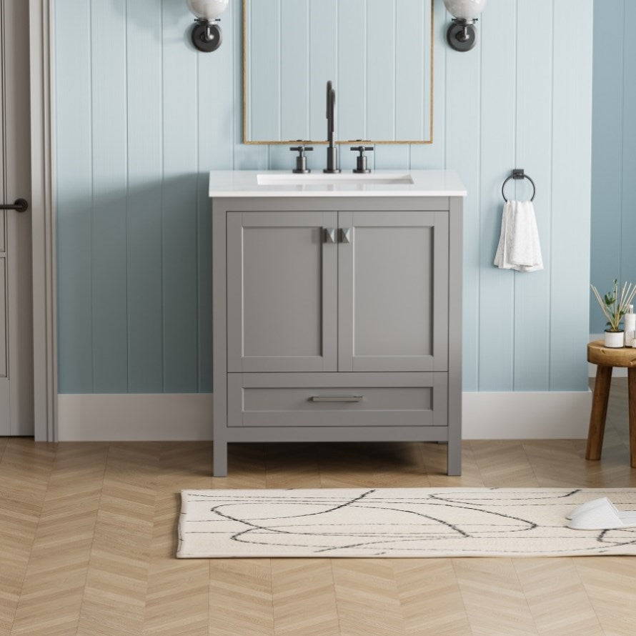 STYLE: This vanity embodies a harmonious fusion of timeless sophistication and contemporary elegance, boasting clean lines and gracefully designed shaker-style doors. Its under-mounted sink ensures a sleek and pristine countertop, optimizing space and enhancing your bathroom storage experience.