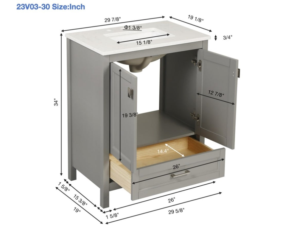 30" Bathroom Vanity with Sink Combo, Fully Assembled Bathroom Sink Cabinet with Marble Countertop, W1573P237850