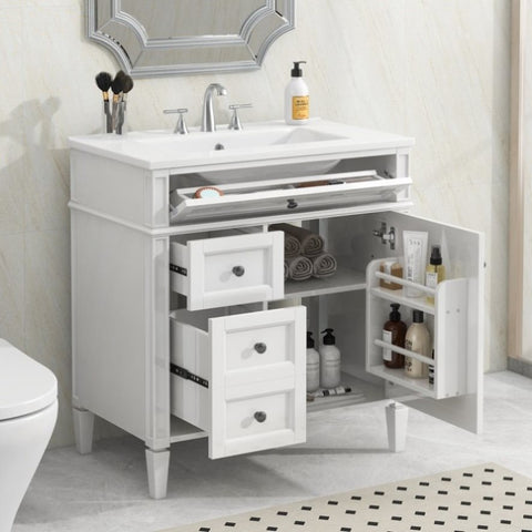 [ Multi-Purpose Cabinet & Concealed Storage ] Are you looking for stylish and functional storage solutions for your bathroom Our bathroom vanity provide ample space for all your toiletries and bathroom essentials. The combination of the cabinet body and the drawer perfectly stores all kinds of bathroom products and keeps the necessities away from water stains and dust. Soft-close doors and drawer fronts feature a water-resistant paint finish for durability.