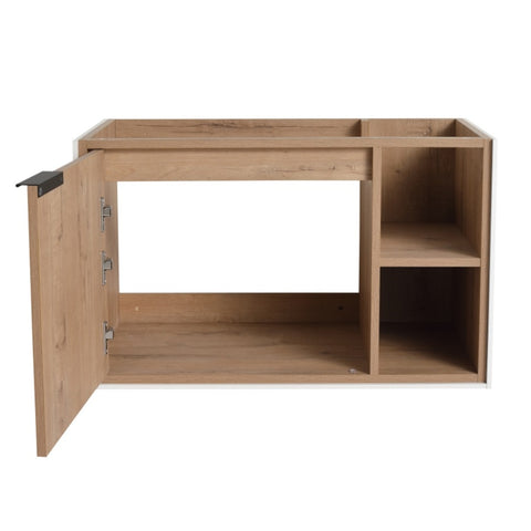 This wall mounted dressing table features a single door design. A layer of plywood has been added to the periphery, not only adding a sense of fashion, but also reinforcing the cabinet, extending its service life. The dressing table is also designed with two open storage racks, which facilitate the classification and storage of daily necessities.