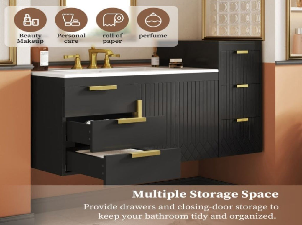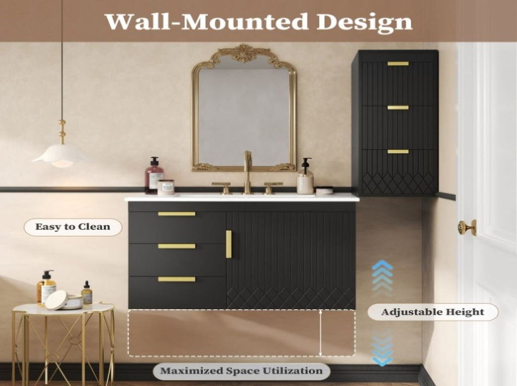This wall-mounted bathroom cabinet masterfully combines generous storage with a sleek, space-saving design to elevate your bathroom's functionality and style. It offers a practical home for all your essentials within its drawers and closing-door compartments, effectively eliminating countertop clutter and promoting a serene, organized environment. The elegant L-Shape handles and subtle stripe carving provide a sophisticated visual detail, while practical features like an adjustable mounting height and an integrated anti-spill hole ensure it adapts perfectly to your space and daily needs. By freeing up valuable floor space, its floating design not only makes cleaning effortless but also creates a feeling of openness, making it an ideal storage solution that delivers both form and function.