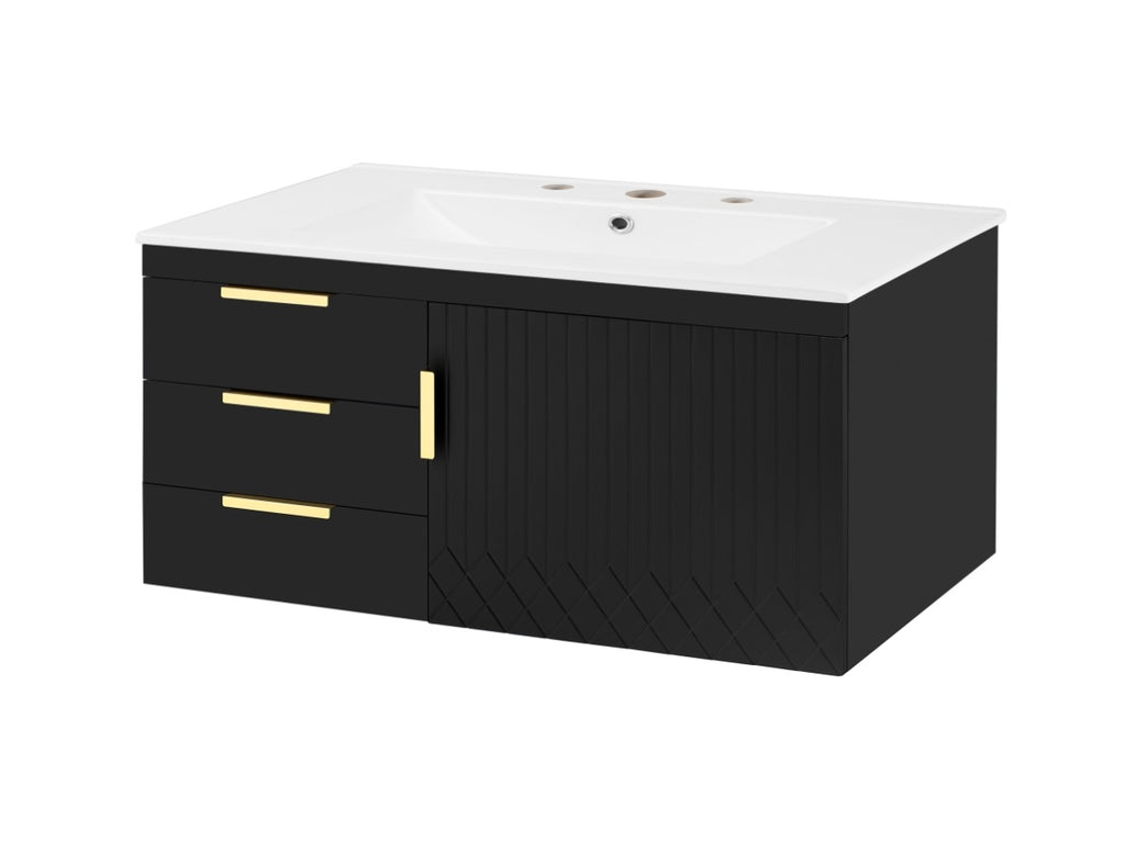 [Refined Design Details] Attention to detail is evident in every aspect of this cabinet. The elegant L-Shape handles are not only comfortable to grip but also add a modern touch. Complementing this is a subtle stripe carving on the surfaces, introducing a minimalist texture that enhances the overall aesthetic without being overpowering. Furthermore, the cabinet is designed to fit an 8-inch widespread faucet, offering perfect compatibility for a streamlined look.