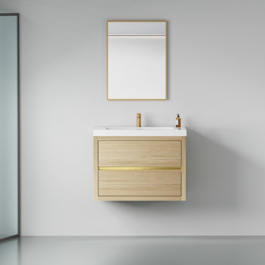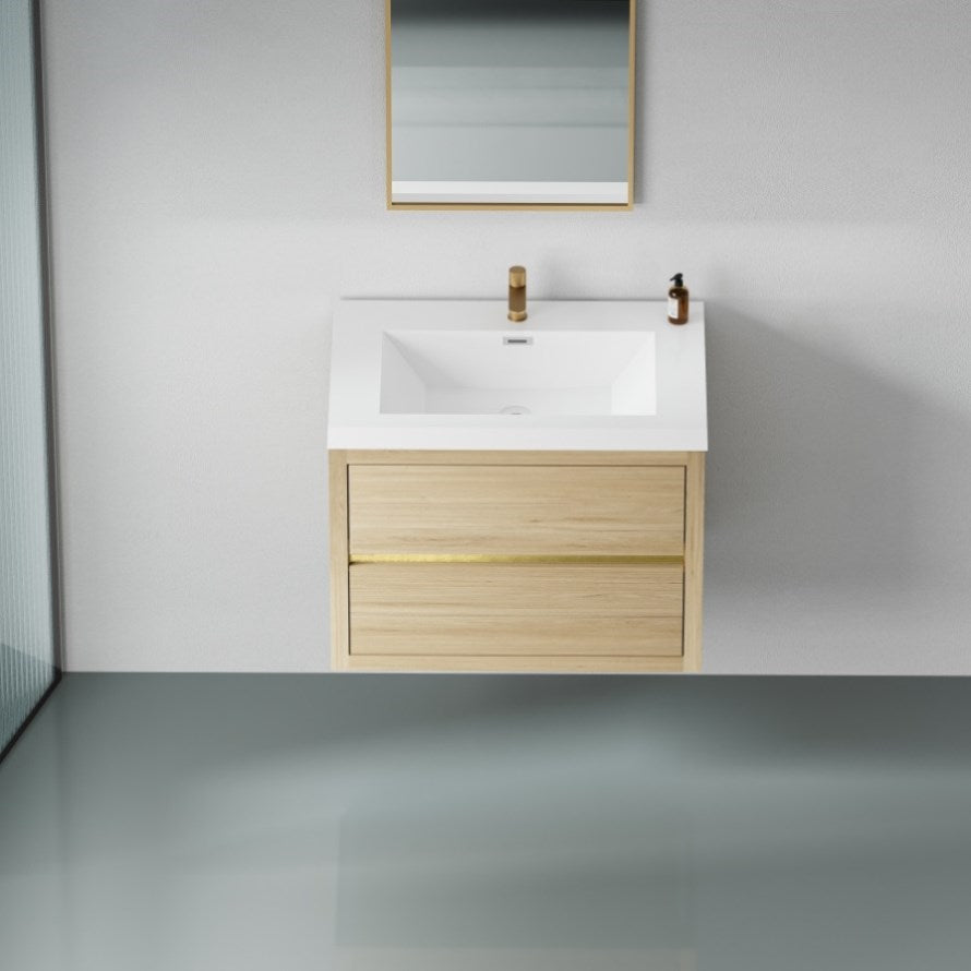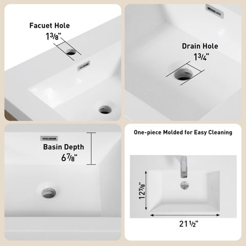 Overall Size: 29-1/2" (L) x 19-3/4" (W) x 22-1/2" (H) Sink Size: 21-1/2" (L) x 12-7/8" (W) Drain Size: φ1-3/4" Faucet Size: φ1-3/8" Finish: Natural Oak Vanity Material: MFC Sink Material: Stone Resin Number of Drawers: 2 Number of Sinks: 1 Package Content 1 x Pre-assembled Vanity Base 1 x Countertop 1 x Installation Manual