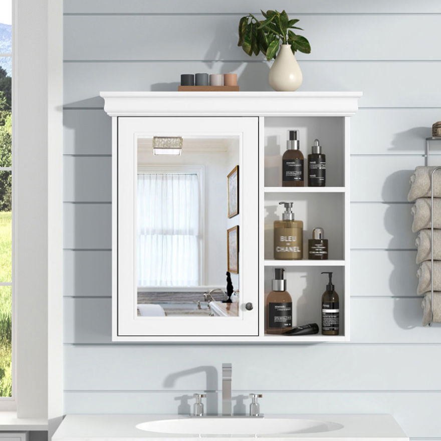 This wall-mounted mirror cabinet is made of high-quality MDF board, which is durable, environmentally friendly and odorless, ensuring long-term stable and reliable use. Equipped with a high-definition mirror, it provides a clear reflection effect, which is convenient for daily grooming. The unique design combines hidden storage and open shelves, which can effectively store sundries and keep them tidy, and display commonly used items. The height of the shelf is adjustable, which can flexibly adapt to the storage needs of different items and perfectly meet your storage needs. Whether it is a bathroom, bedroom or living room, this mirror cabinet can perfectly integrate into your home environment, improving the cleanliness of the space and convenience of use.