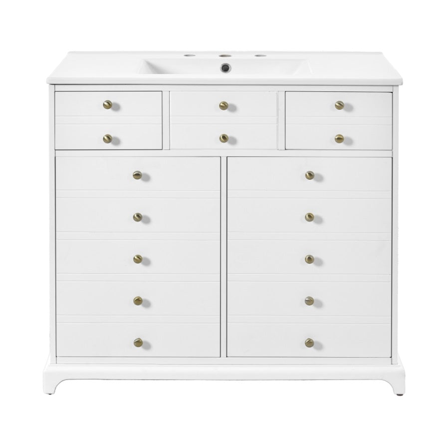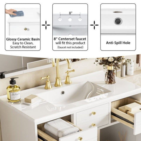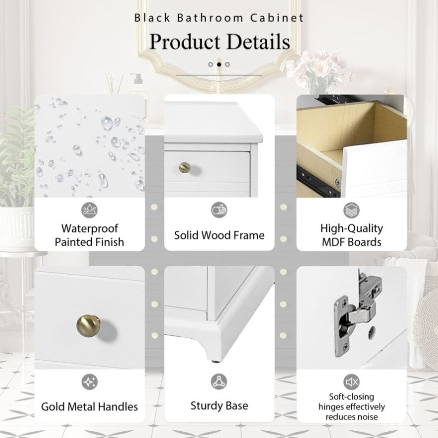 [ Multi-Purpose Cabinet & Concealed Storage ] Are you looking for stylish and functional storage solutions for your bathroom Our bathroom vanity provide ample space for all your toiletries and bathroom essentials. The combination of the cabinet body and the drawer perfectly stores all kinds of bathroom products and keeps the necessities away from water stains and dust. Soft-close doors and drawer fronts feature a water-resistant paint finish for durability.