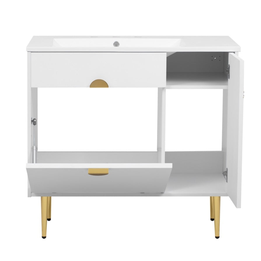Elevate your bathroom with this thoughtfully designed vanity that masterfully blends ample storage and modern aesthetics. The spacious layout features a large drop-down cabinet and soft-closing storage compartment for organized convenience, complemented by a large area beside the basin for quick access to daily essentials. Its clean-lined contemporary design, accentuated by unique handle details and elegant tapered legs, effortlessly adapts to various decor styles from minimalist to transitional. Built for lasting performance, the vanity showcases a durable resin basin that resists wear while maintaining its sleek appearance, supported by premium hardware and whisper-quiet closing mechanisms. Practical touches include an 8-inch standard faucet cutout (faucet not included), anti-spill hole, and strategically placed storage areas that maximize space efficiency. Combining form and function, this vanity serves as both a stylish focal point and practical storage solution, creating an organized and inviting bathroom atmosphere with its easy-to-maintain surfaces and thoughtful design elements that enhance daily routines.