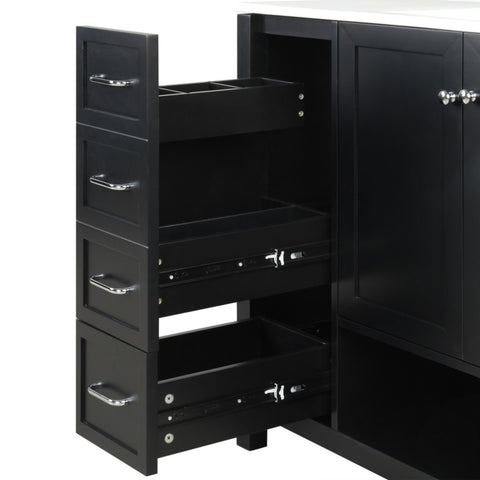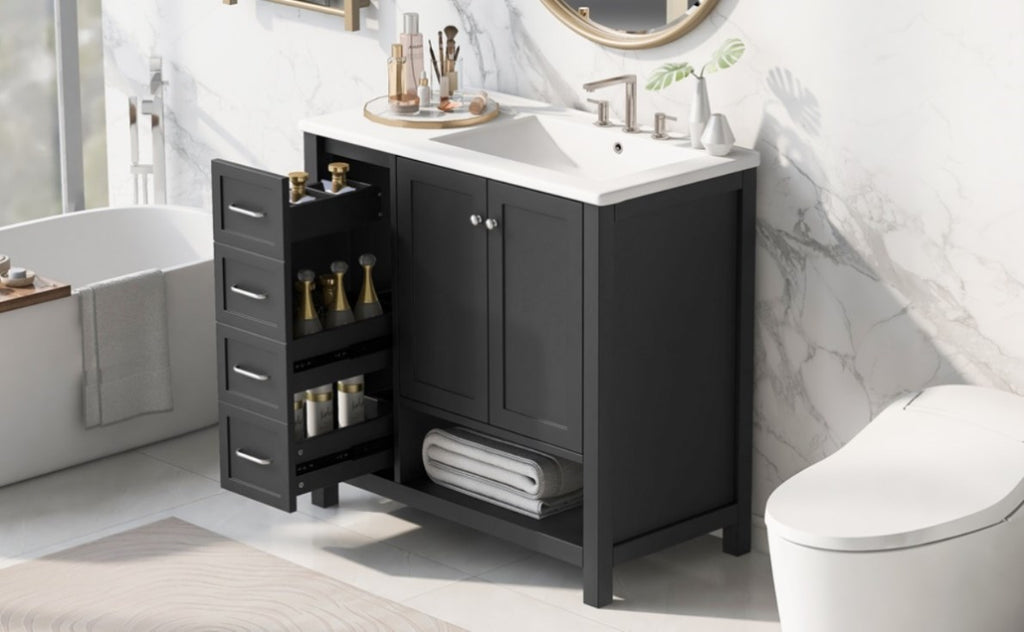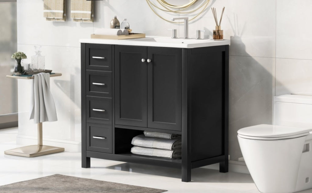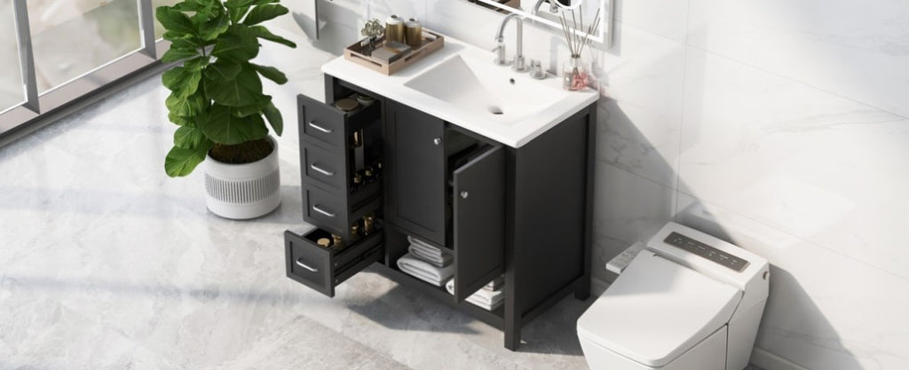 Vanity with Cabinet & Drawers: Designed to withstand the humid bathroom environment, this vanity features generous enclosed storage options, including a cabinet with two doors and two smooth-gliding drawers. Perfect for storing soaps, towels, shampoos, tissue paper, and other bathroom essentials, it helps keep your items organized and protected from dust while maximizing space efficiency.