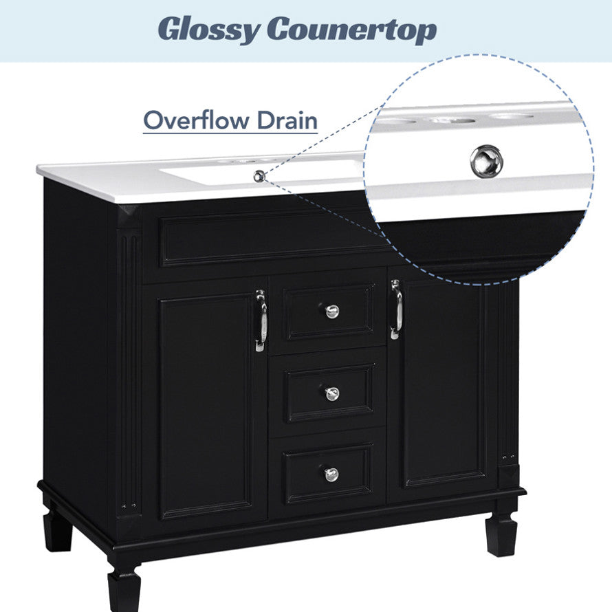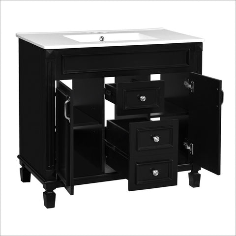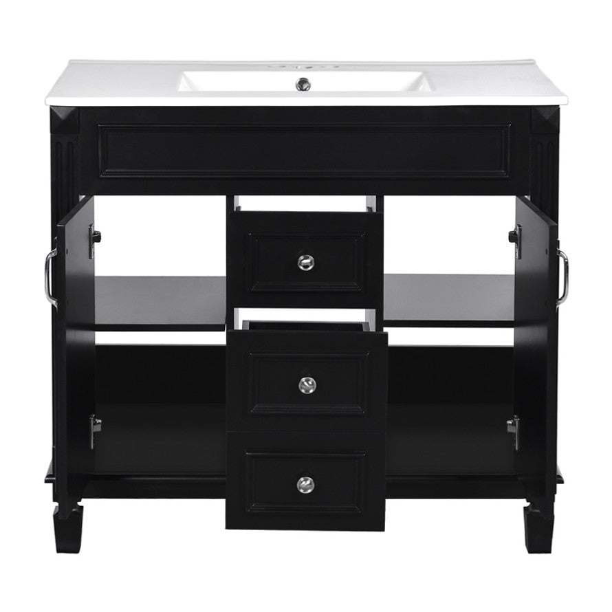 This 36-inch black ceramic basin bathroom cabinet is made of high-quality MDF and solid wood frame, which is both exquisite and practical. Its modern and simple style can not only add a stylish touch to the bathroom, but also has superior durability and stability. The perfect match between the black ceramic basin and the cabinet body highlights a sense of low-key luxury.