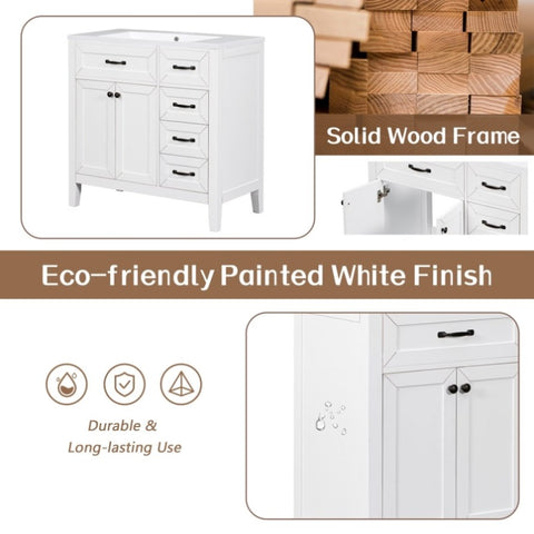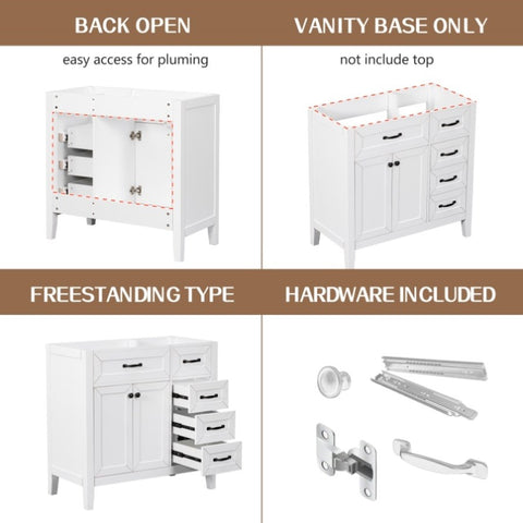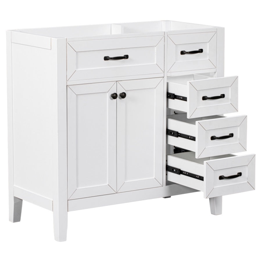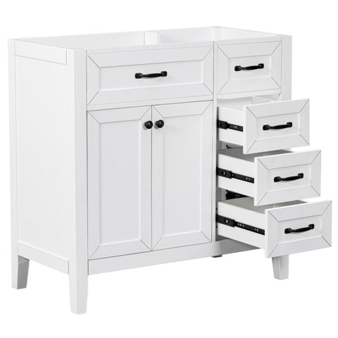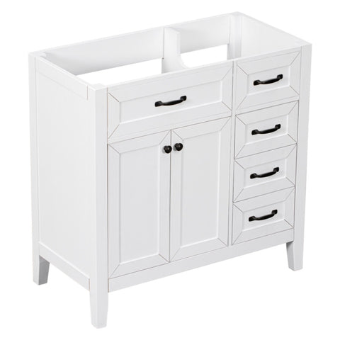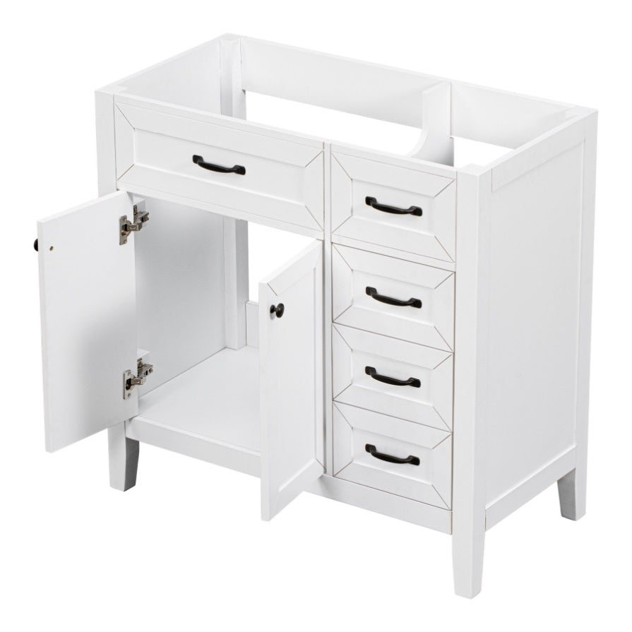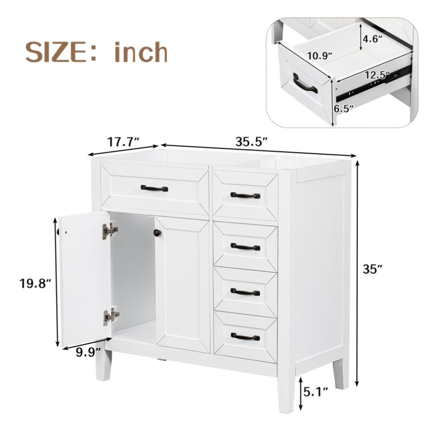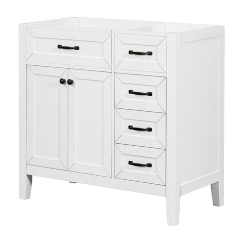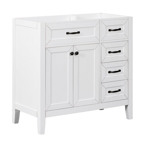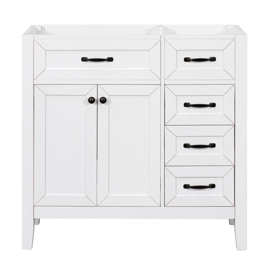 Stylish 36" Bathroom Vanity Base Only: This 36" bathroom vanity is suitable for bathroom in any decoration style. Freestanding white vanity cabinet with black handles complies with your bathroom facilities. The groove design on the door and drawer increases the artistry and aesthetics of the home environment. If you're looking for a simple but stylish bathroom sink vanity, our product will be a great choice to upgrade your bathroom.