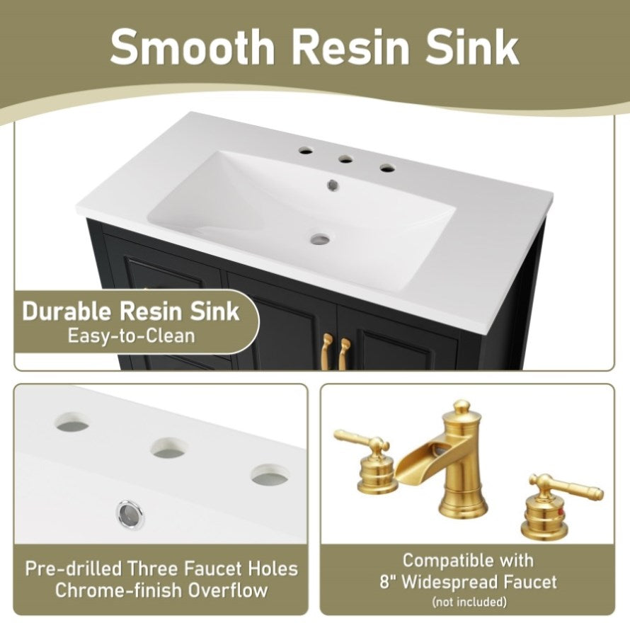 Resilient Resin Sink——The integrated resin sink boasts a soft texture, combining elegance with durability. Resistant to cracks and easy to maintain, it resists stains and daily wear. Pre-drilled with three faucet holes, it’s compatible with 8-inch widespread faucets (faucet not included).