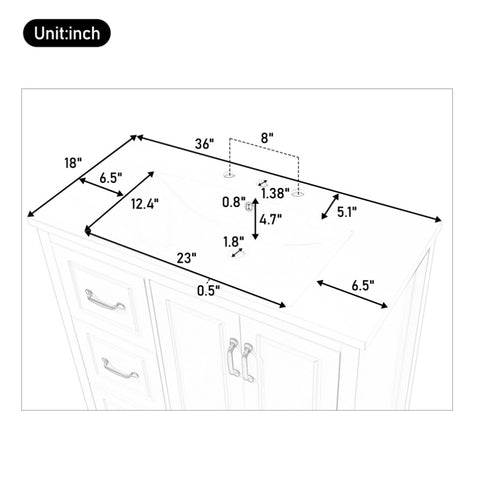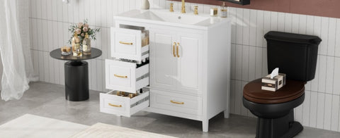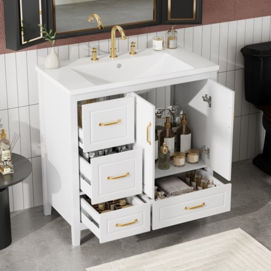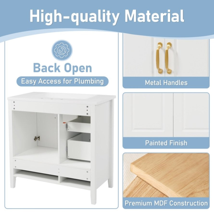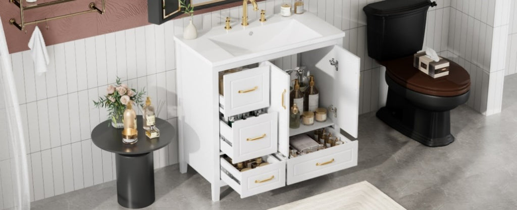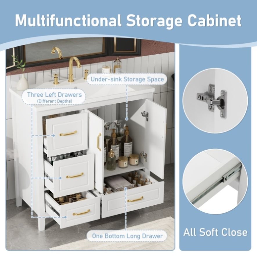1. 36" Classic Freestanding Design 2. MDF Board, Gold Metal Handles 3. Resin Sink, 3 Holes, 8" Fit 4. 2-Door Soft-Close Cabinet 5. 4 Soft-Close Drawers (3 Sizes + 1 Long) 6. Open Back for Plumbing 7. One Package, Assembly Kit Included