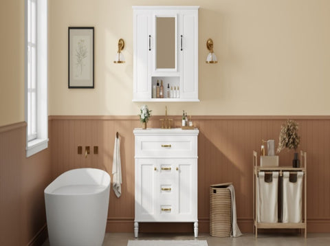 Concealed Storage Cabinet: The cabinet doors with mirror coverings provide both functionality and privacy. The center door is designed to store personal items, making full and efficient use of space. Placing your essentials in this spacious cabinet not only helps keep your bathroom neat and organized but also protects them from dust.