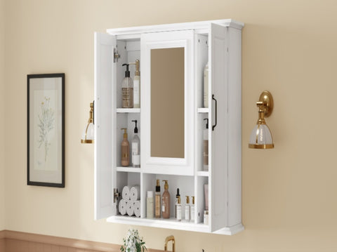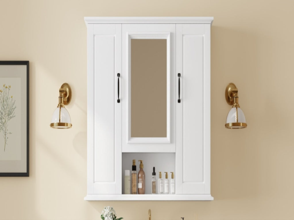 Mirror Cabinet: The wall-mounted design with integrated mirrors saves you the hassle of choosing and installing a separate mirror. This mirror cabinet meets multiple needs — it functions as a practical storage unit while also serving as a convenient makeup mirror, making your daily routine more efficient.