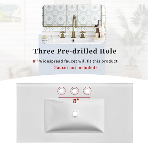 [Ceramic Sink] The elegant white ceramic sink features a rectangular basin with an integrated overflow and a three-hole faucet holder. Its half-moon design extends almost to the edge, providing ample space for daily use. Ceramic is very easy to clean and can easily ensure a smooth and shiny appearance. Please note that 8-inch center faucets are compatible with this sink (faucet not included).