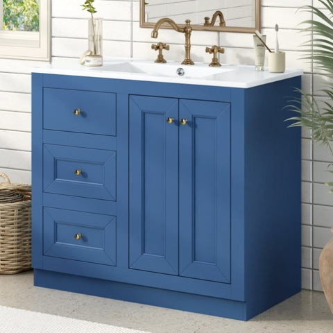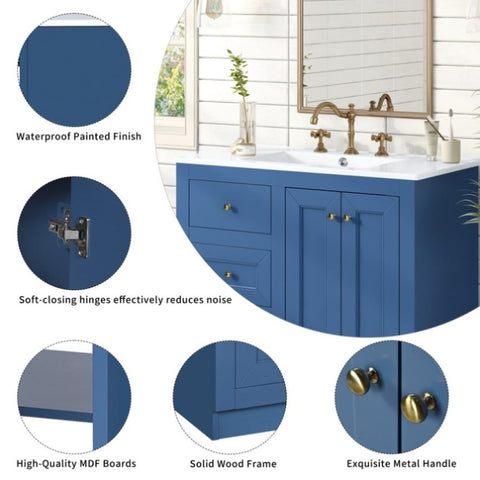 This 36-inch blue ceramic basin bathroom cabinet is carefully designed to combine modernity and practicality, adding a touch of bright color to your bathroom. The high-quality ceramic basin is matched with smooth lines, and the smooth surface is easy to clean, durable and stain-resistant. The cabinet body is made of high-density environmentally friendly board, which is stable and durable, moisture-proof and waterproof, ensuring stability for long-term use. The cabinet design includes two drawers and a storage cabinet, providing abundant storage space to help you easily store bath towels, toiletries and other daily necessities. The drawer adopts a silent slide design, which opens and closes smoothly, greatly improving the user experience.