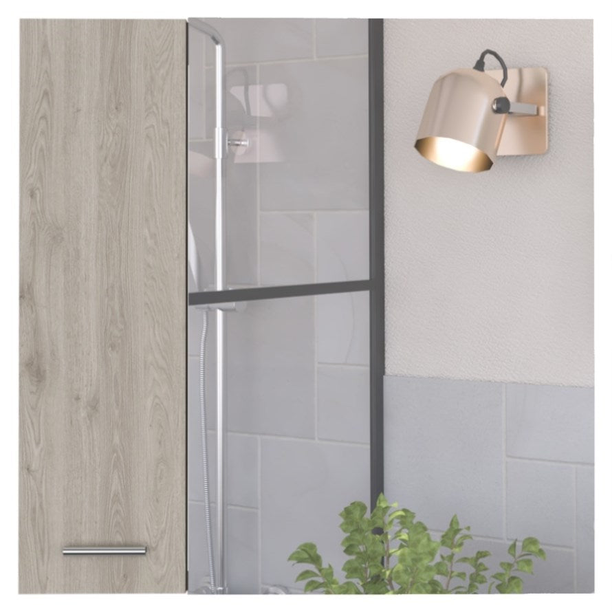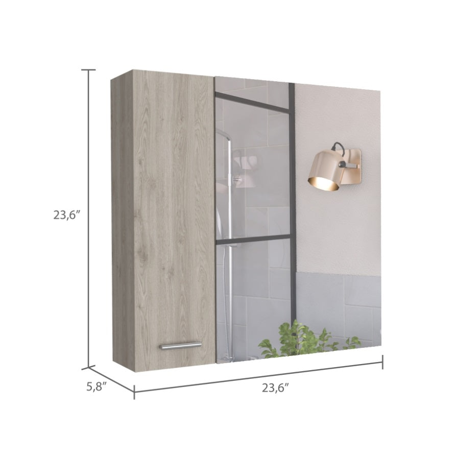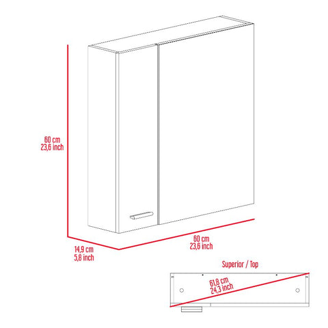 This cabinet includes a generous mirror and four interior shelves in a double-door design for ample storage and easy access. The superior top adds extra surface space for enhanced functionality.