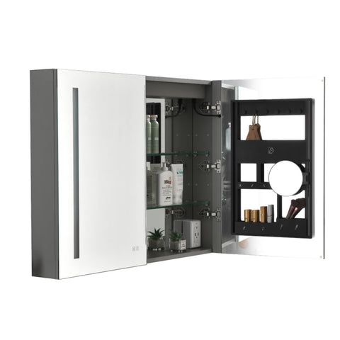 Mirrors on both sides of the door, interior walls & both side panels, which makes it a bathroom cabinet with mirror on all sides.The spacious storage space inside, it also comes with adjustable glass shelf, a built-in magnifying mirror and a socket to meet your use needs.