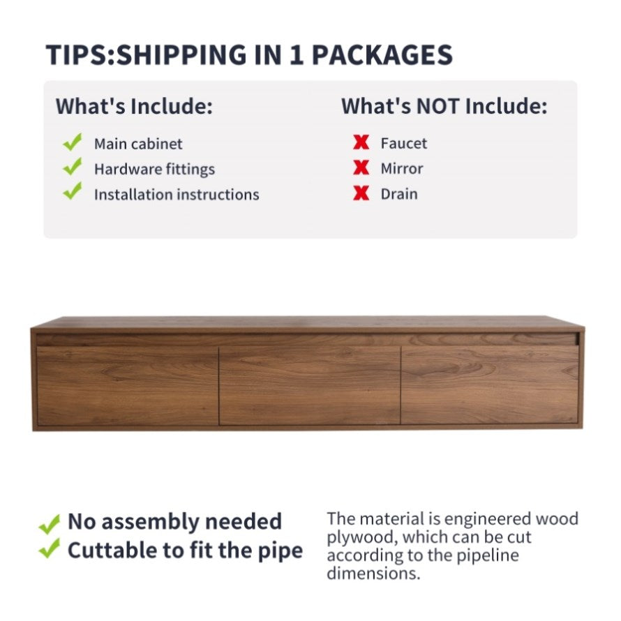 | Package not include: | Sink, Faucet, Pop-up Drain, Drain Assembly, P-Trap, Back-splash and Mounting Bracket are not included |