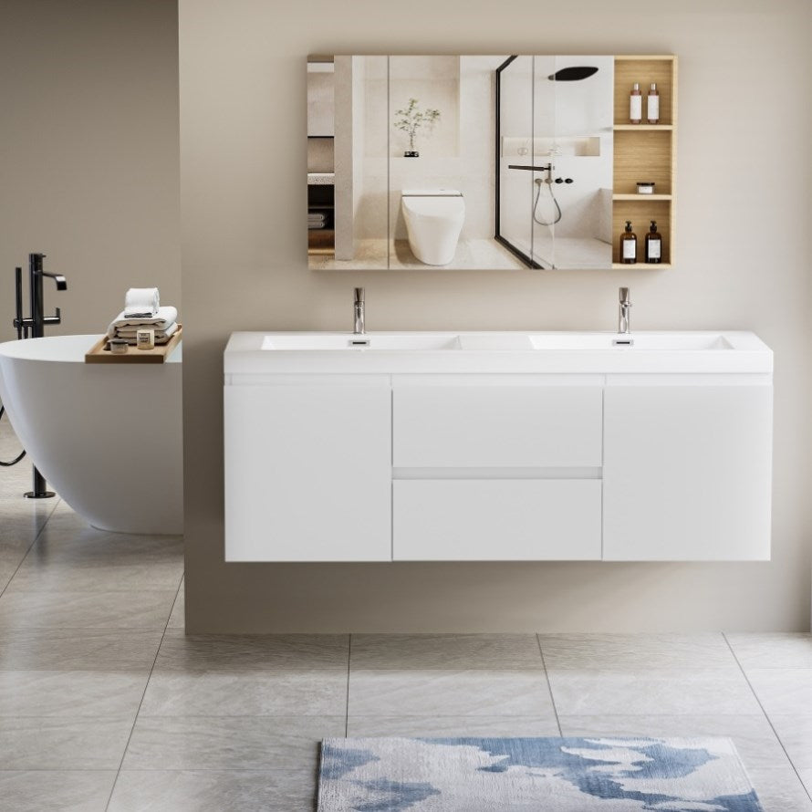 Clean and Functional: Enhance your bathroom with this space-saving, wall-mounted vanity to neatly organize cosmetics and other essentials. Its modern, minimalist design enhances the aesthetics of your space while maximizing functionality.