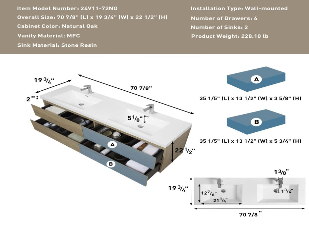 72" Floating Bathroom Vanity with Sink (24V11-72NO)